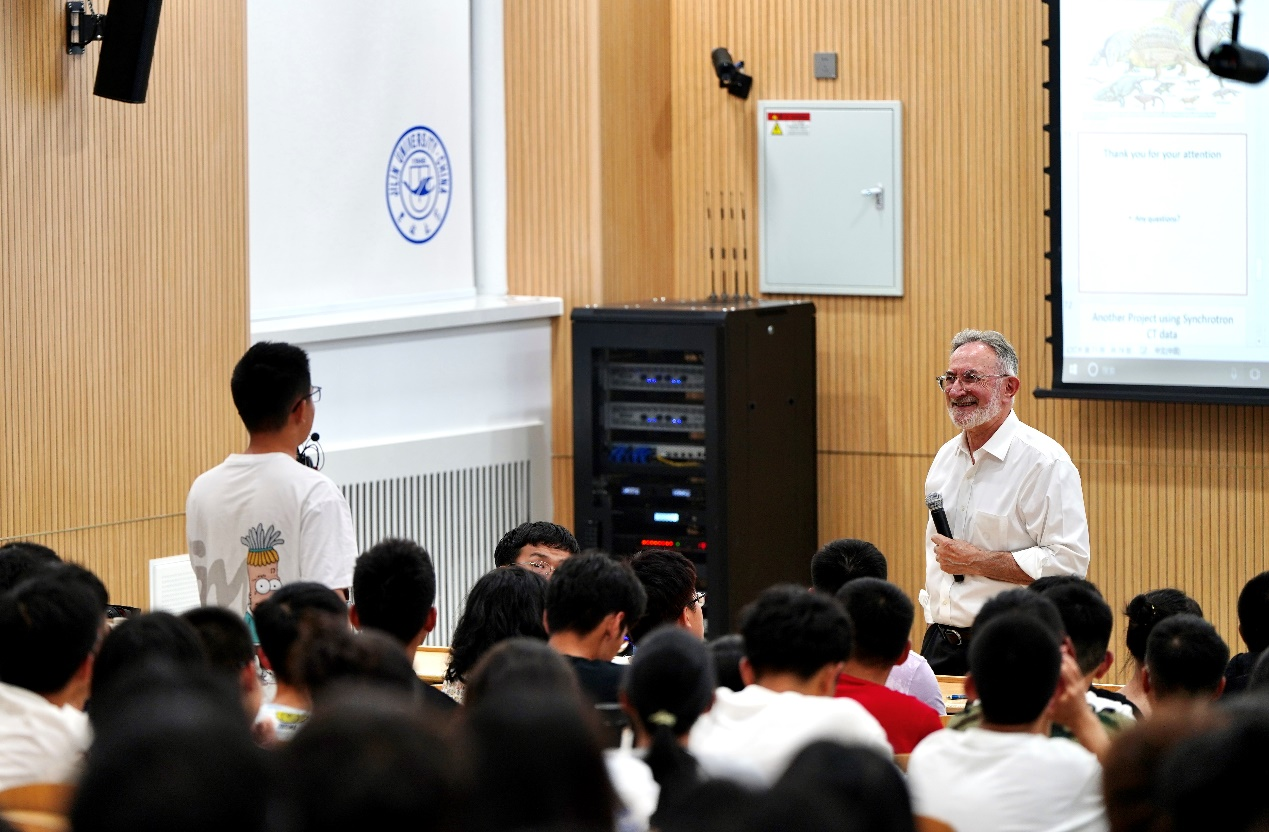 赖兹院士简要介绍了大鼻龙的种类、特征、存在的地质时期和分布范围以及产出位置,并对化石采场脊椎动物的埋藏学原理进行了说明。随后,赖兹院士重点针对大鼻龙类牙齿咀嚼方式的进化、大鼻龙类的断尾行为、大鼻龙属与陆地呼吸等科学问题进行了说明,阐明了研究的思路和方法,向学生们展示了解决科学问题的完整思路。最后,赖兹院士还以显微CT成像等交叉学科技术手段研究古生物化石为例,强调了运用新技术研究化石的重要性。