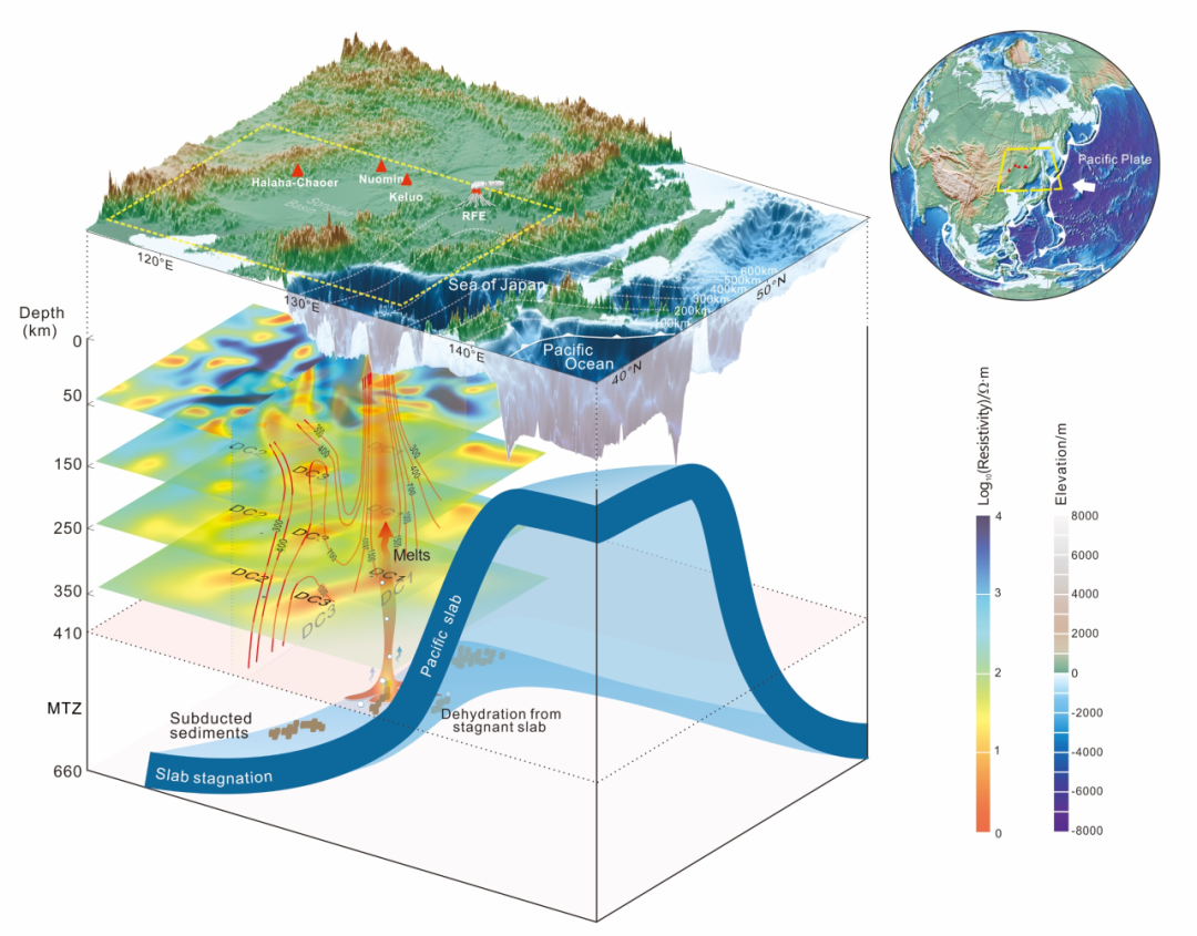 图1 东北亚新生代火山活动分布三维示意分布图。图中DC为不同深度和过火山的电阻率切面的低阻异常中心。