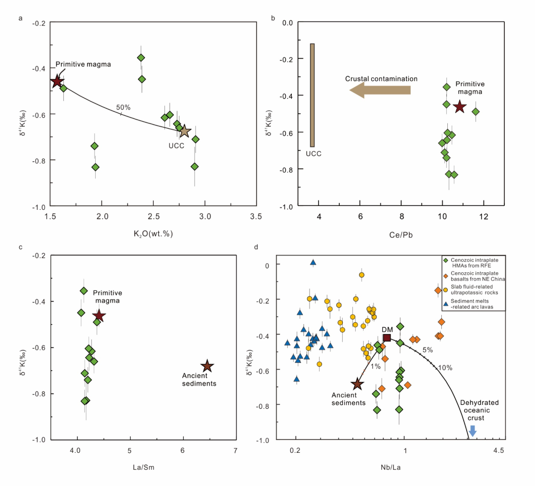 图2 俄罗斯远东新生代高镁安山岩(a)K同位素vs K2O图解;(b)K同位素vs Ce/Pb图解;(c)K同位素vs La/Sm图解;(d)K同位素vs Nb/La图解