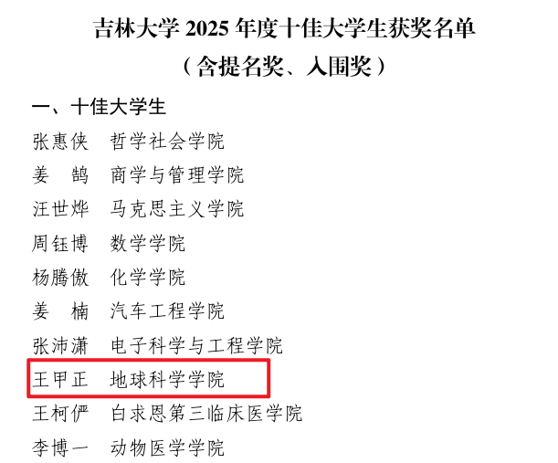 2022级本科生王甲正连续三年专业第一,58门课程满绩,斩获全国大学生不动产估价大赛国家一等奖等荣誉40余项,发表高水平论文,累计担任17项学生干部职务,志愿服务超2200小时,以实际行动践行守土兴邦的地学使命,获评“十佳大学生”荣誉称号。