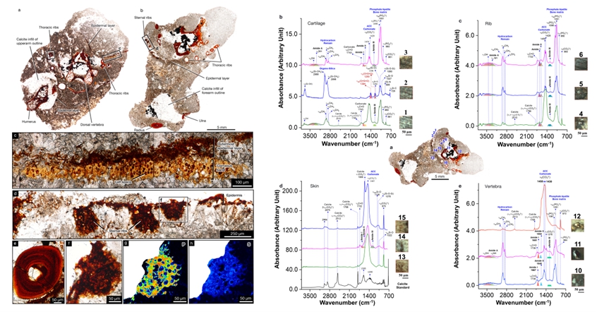 地球化学分析显示,在高分辨率XRF扫描和EPMA扫描结果中,常见元素在钙化软骨、骨化组织、皮肤表皮、下方角质带之间的分布均存在显著差异;在SR-µATR-FTIR光谱结果分析中发现,研究样本的钙化软骨、骨组织和皮肤中存在明确的蛋白质特征(表现为酰胺I、Ⅱ、Ⅲ带吸收峰),该发现亦将在化石中发现内源性含酰胺生物分子蛋白质残留物的时间记录又提前了将近1亿年(此前的记录为早侏罗世)。