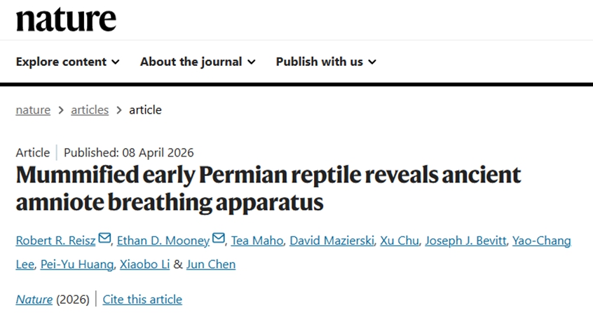 、恐龙演化研究中心罗伯特·赖兹(Robert Reisz)院士领导的国际联合交叉学科研究团队在学术期刊《Nature》上发表题为“Mummified early Permian reptile reveals ancient amniote breathing apparatus”的研究论文,报道了对早二叠世Captorhinus(大鼻龙属,生存于石炭纪晚期至二叠纪早期的原始爬行动物)木乃伊化石研究取得的新进展,首次揭示了羊膜动物(包括人类在内的脊椎动物主要类群)肋式呼吸(Costal aspiration breathing)机制的起源之谜。并且该项研究还将已知最古老的陆生脊椎动物软组织化石及蛋白质残留的保存记录向前推进了约1亿年。