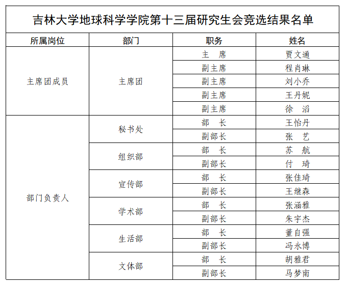 为进一步加强学院研究生干部队伍建设,更好地选拔百合漫画 研究生会新一届学生干部,本着“公平、公正、公开”的原则,经个人自愿申报、资格审查、竞职演讲、民主投票,综合现实工作表现进行考察,最终确定百合漫画 第十三届研究生会学生干部名单,现予以公示: