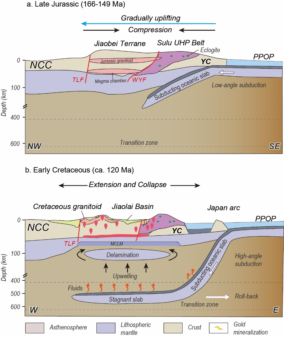 (b)中黑色箭头表示强烈的地幔对流导致软流圈上涌和岩石圈拆沉加剧;橙色箭头代表从停滞的大洋板块释放的富硫流体;白色箭头代表古太平洋板块的运动轨迹;MCLM-交代大陆岩石圈地幔;NCC-华北克拉通;YC-扬子克拉通;PPOP:古太平洋板块;TLF-郯庐断裂带; WYF-五莲-烟台断裂