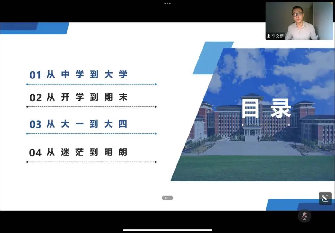 2022级新生“拥抱你的大学生活”主题讲座以线上腾讯会议的方式顺利举行。2022级辅导员曲鹏展老师及2022级全体本科新生参加此次讲座,2020级8班班主任李文博老师以“拥抱你的大学生活”为题与同学们进行交流分享。