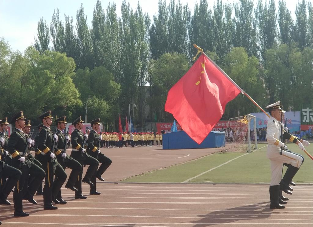打头的护旗手六人围住五星红旗,鲜艳的五星红旗,提醒所有学子不忘初心,砥砺前行。而后阵中的国防生仪仗队身着海陆空三色军服,手握钢枪,整齐划一的步伐铿锵有力。“一身男儿血,满腔报国志。”雄姿英发的他们展现了新一代大学生军人光明磊落的精神风貌。今日他们努力学习科学文化知识,明日他们将奔赴绿色军营,扎根在祖国最需要的地方,保家卫国,戍守边防。