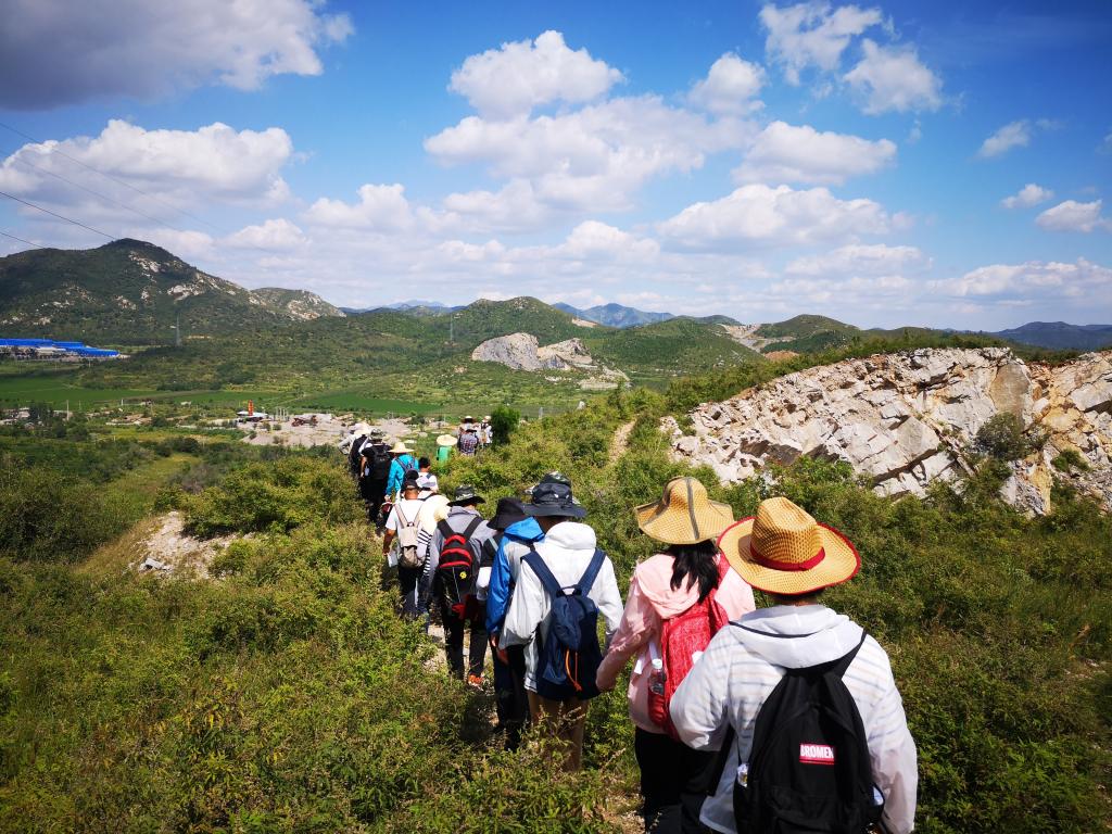 后由于大陆隆升,存在晚奥陶至早石炭的沉积间断。我们逐渐上山,观察到中石炭本溪组,与马家沟组平行不整合,本溪组为海陆交互相,可观察到土黄色粉砂、细砂岩夹青灰色灰岩。后见整合接触太原组与山西组,发育灰黑色页岩,这两个组不易区分,且都含有丰富植物化石,有煤层。在山顶可见中晚二叠石盒子组含砾石英粗砂岩。登顶后下山见晚二叠蛤蟆山组单成分砾岩,砾石大小不一,有些竟似人头般大小和圆润,谓之“人头砾岩”。最后在山脚下见到了早三叠红砬组紫红色粉砂岩。