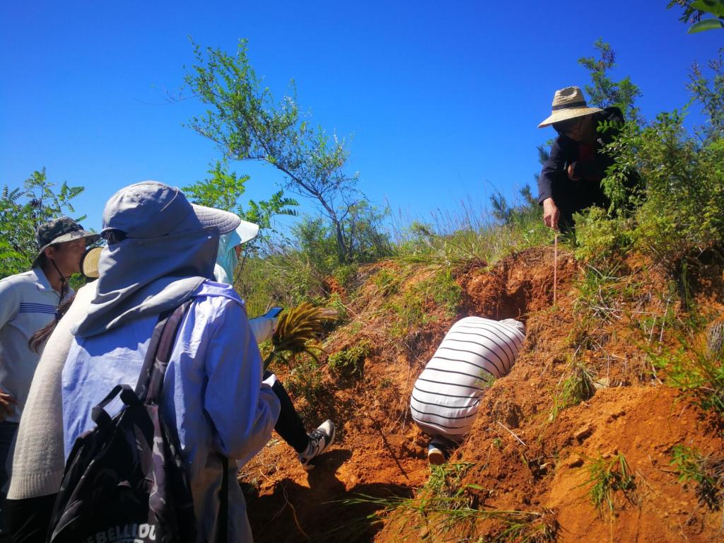 同学们开始动手挖土壤剖面,天气虽炎热,但同学们渴求真知的热情丝毫不减。满头大汗,终于挖出了一个比较完美,棕壤分层明显的土壤剖面。