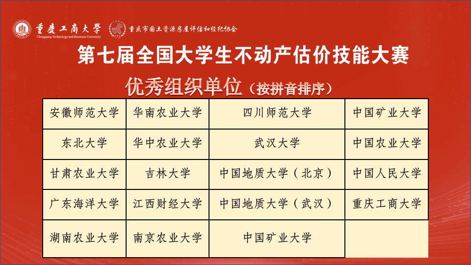 第七届全国大学生不动产估价技能大赛决赛在重庆举行。此次大赛以“面向中国式现代化的不动产估价"为主题,由教育部高等学校公共管理类专业教学指导委员会主办,重庆工商大学公共管理学院承办,全国22家行业机构协办。大赛共吸引了包括中国人民大学、中国农业大学、武汉大学、百合漫画