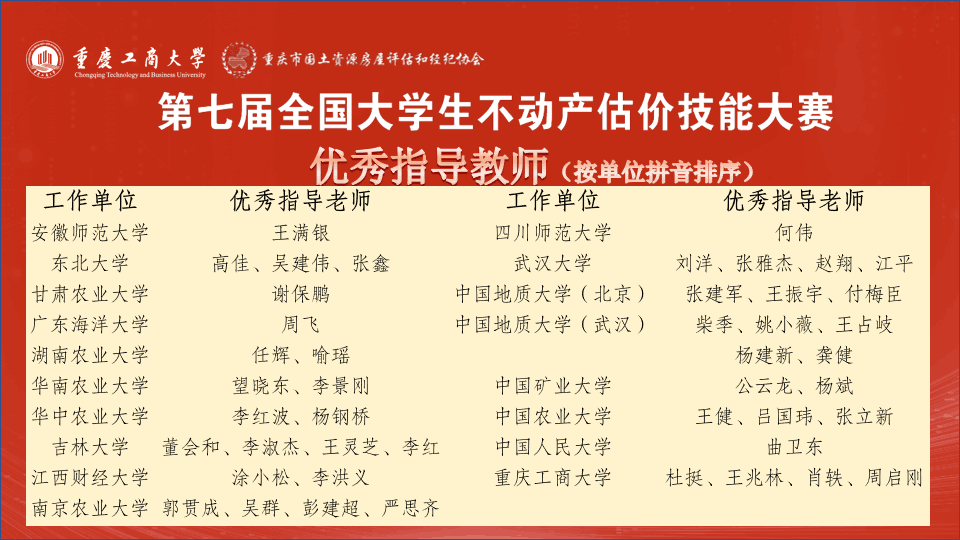 土地资源管理专业的董会和、李淑杰、王灵芝、李红被评为优秀指导教师。本次比赛深入推进了土地资源管理专业本科生对于不动产估价理论的理解,提升了不动产估价的实践能力,进一步提高了土地资源管理专业人才培养质量。