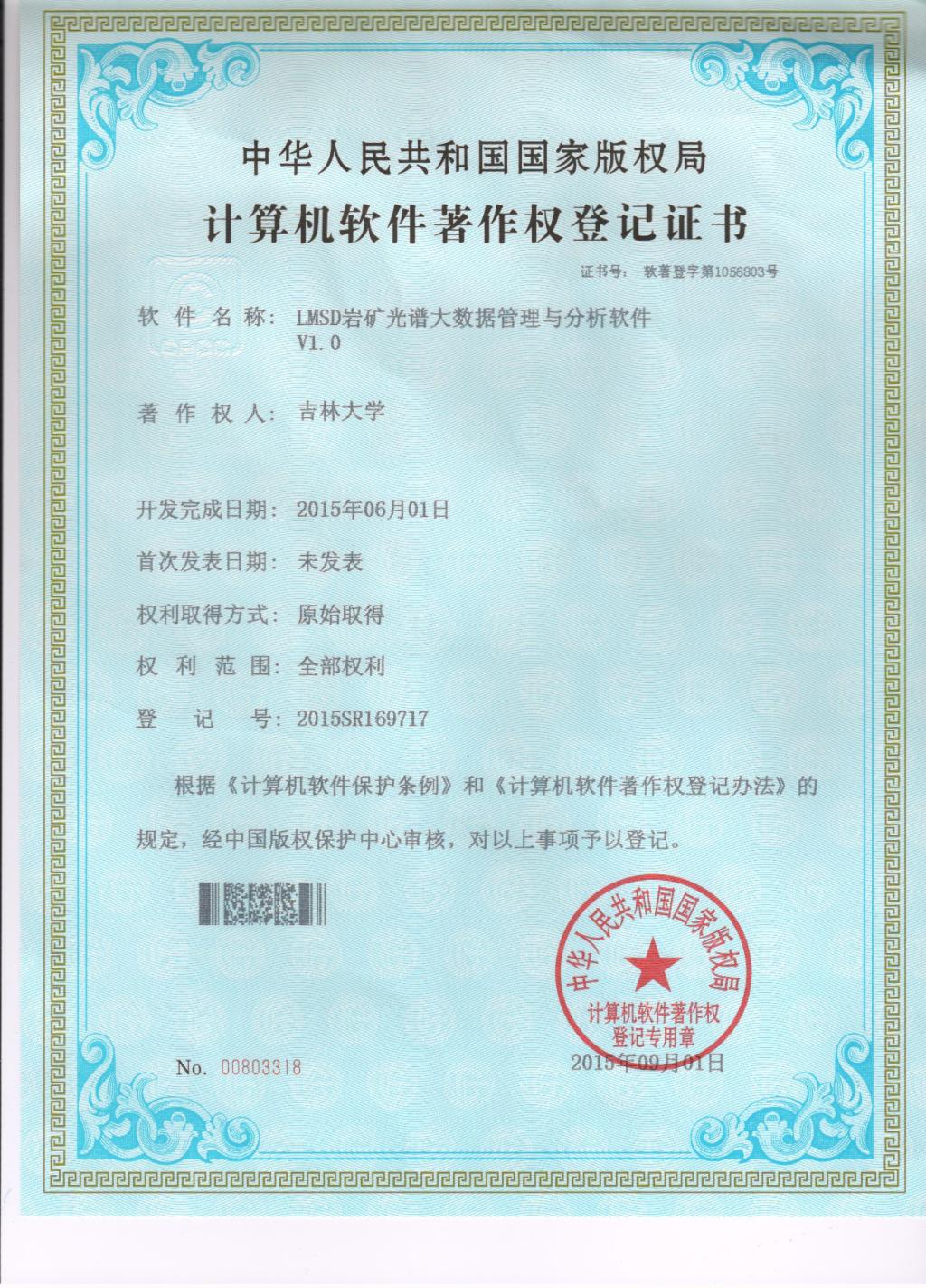 LMSD岩矿光谱大数据管理与分析软件 贺金鑫等 国家版权局 2015SR169717