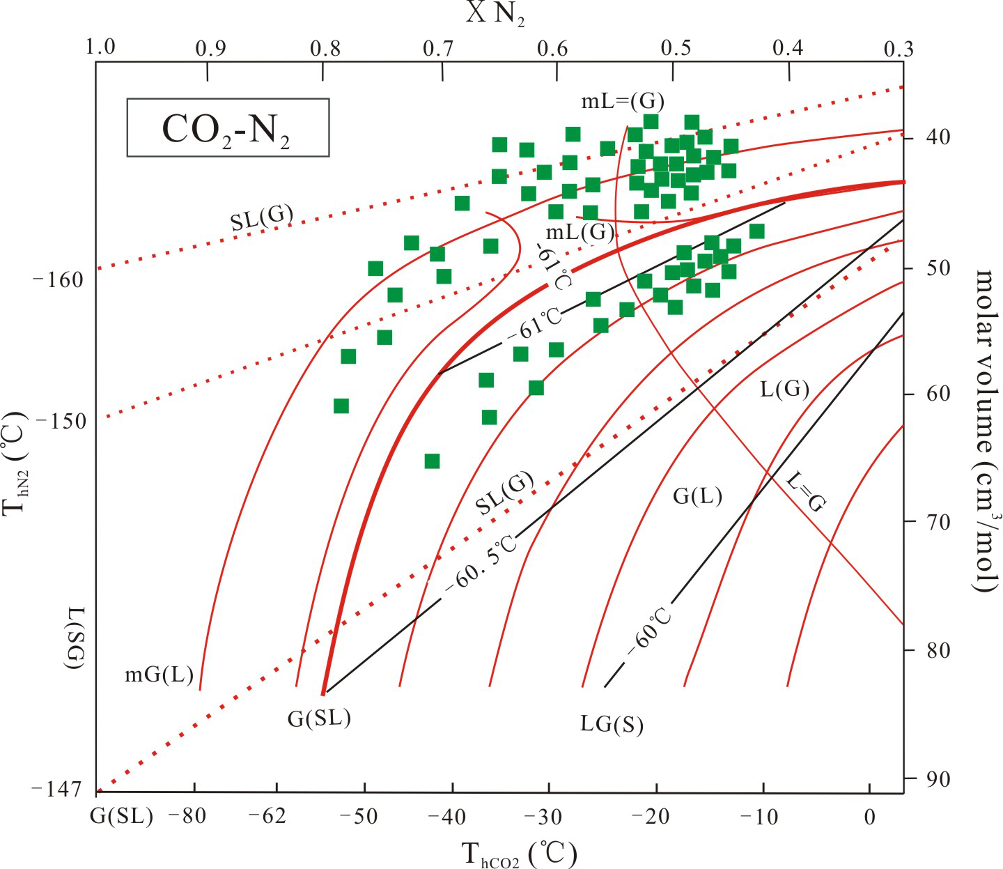 包裹体岩相学研究表明,矿石石英中发育气相、富气相、含CO2及气液两相四种类型原生流体包裹体(图1),根据测温过程中包裹体复杂的相变特征、相变温度(图2)及单个包裹体激光拉曼光谱成分分析(图1),证明成矿流体为一类成分复杂的富N2流体体系,各类包裹体中N2及CO2含量变化大(图3),排除了不同类包裹体为原始均匀流体不混溶作用结果的可能性;结合氢-氧-氮同位素分析结果,提出成矿流体为岩浆来源NaCl-H2O-CO2体系热液与变质富N2流体混合产物的新认识。成矿流体中大量N2气的加入,有力促进了白钨矿的沉淀,是白钨矿矿床形成的重要机制。