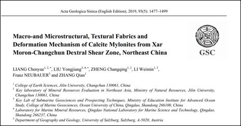 以上研究成果发表在Acta Geologica Sinica - English Edition上(Liang, C.Y., Liu, Y.J., Zheng, C.Q., Li, W.M., Neubauer, F., & Zhang, Q. (2019). Macro-and Microstructural, Textural Fabrics and Deformation Mechanism of Calcite Mylonites from Xar Moron-Changchun Dextral Shear Zone, Northeast China. Acta Geologica Sinica - English Edition, 93(5), 1477-1499. doi:10.1111/1755-6724.14357